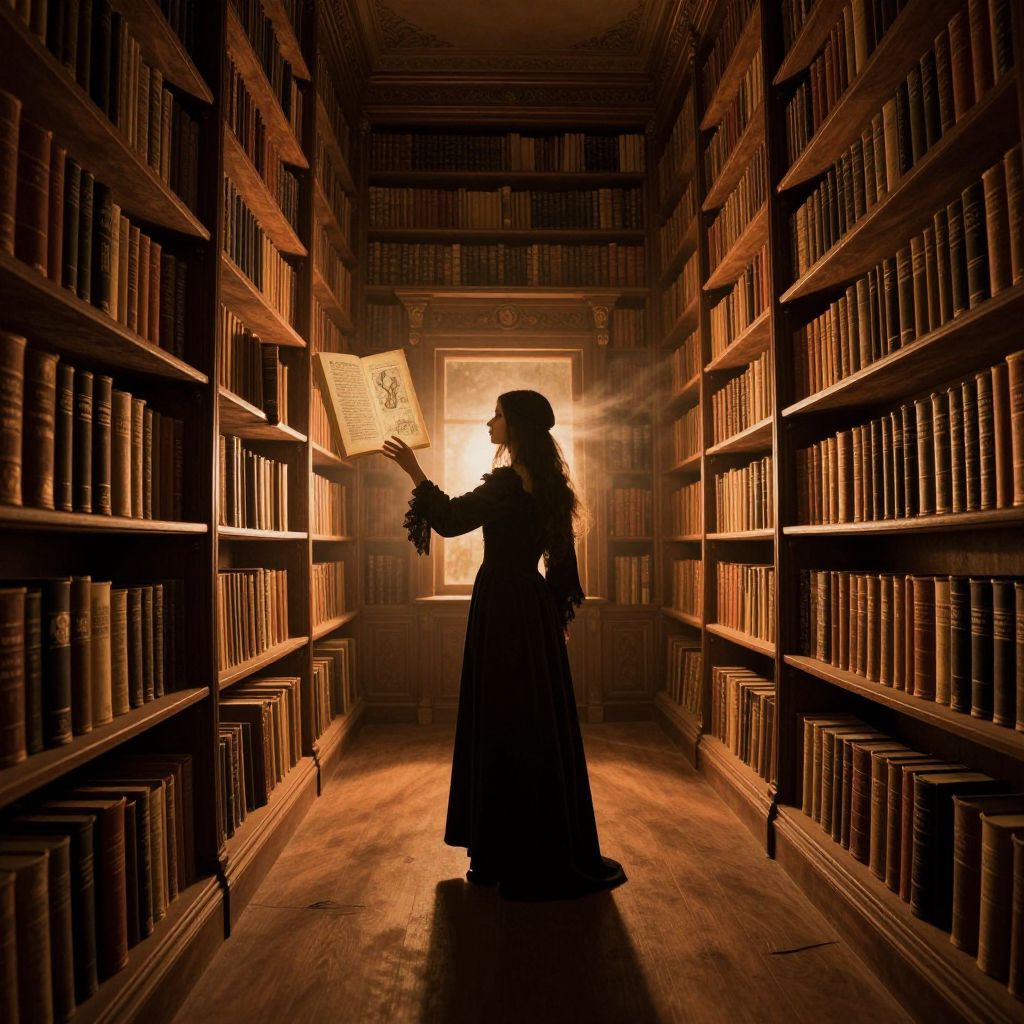 Photograph of a dimly-lit library aisle with wooden shelves filled with books on both sides. A silhouette of a woman with long hair, dressed in a dark, flowing gown, stands in the center, holding an open book illuminated by a bright sunbeam coming through a window at the far end. The sunlight creates a dramatic, backlit effect, highlighting the woman's figure and the edges of the books. The floor is wooden, and the overall atmosphere is warm and mystical, evoking a sense of mystery and introspection.