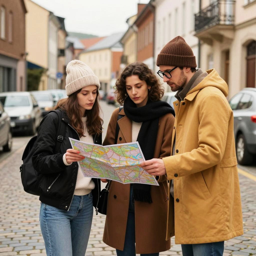 Photograph of three friends standing on a cobblestone street in an urban area, looking at a colorful map. The woman on the left wears a black jacket and beige knit hat, the middle woman in a brown coat and black scarf, and the man on the right in a yellow coat, brown beanie, and glasses. The background shows blurred buildings and a few parked cars.