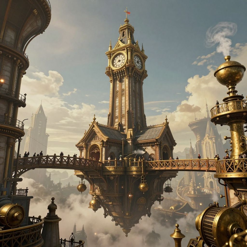 Steampunk floating city featuring a grand clocktower, floating bridges of metal and wood, billowing steam engines, lively skyborne life, warm brass hues, richly textured, cinematic perspective