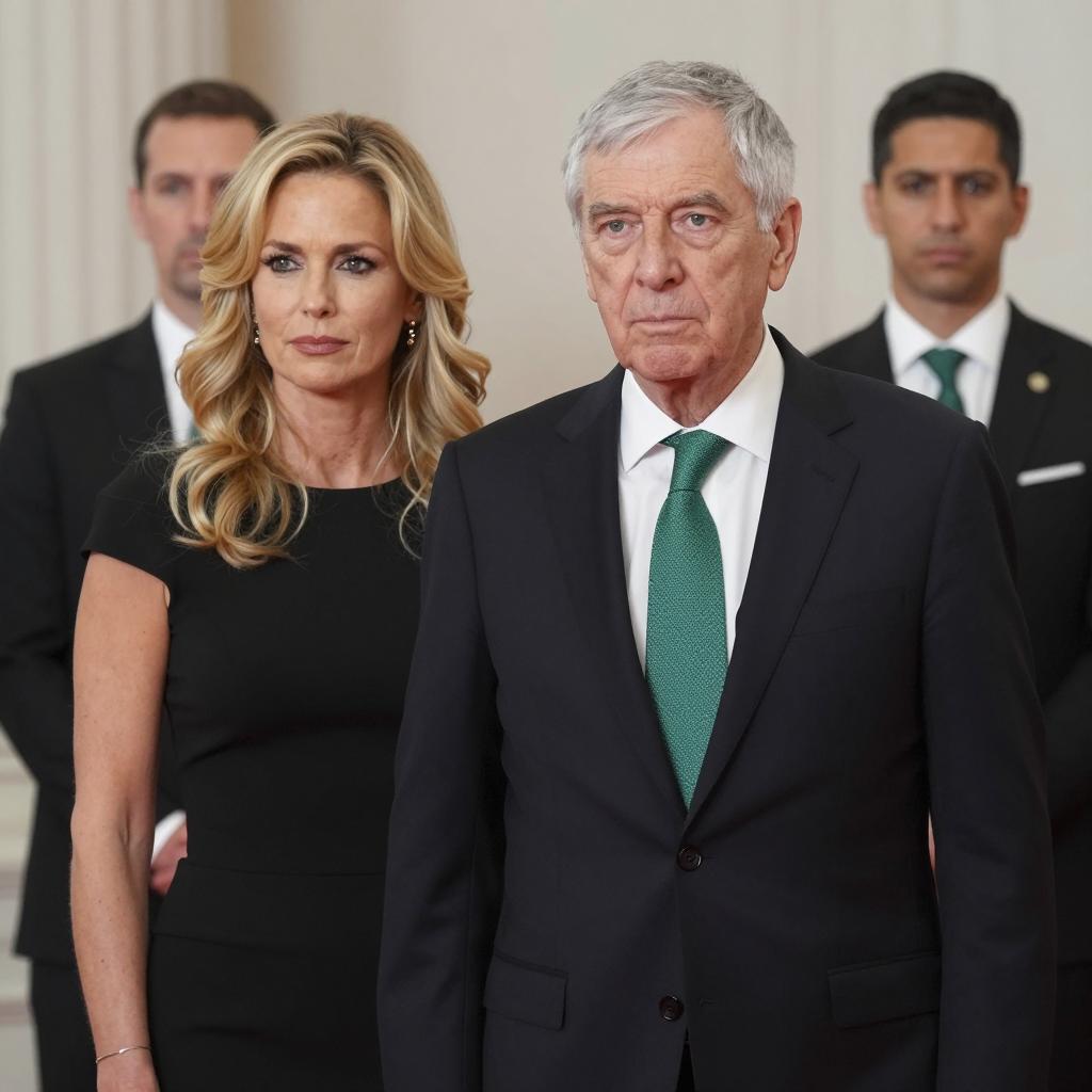Close-up portrait of an elderly white man with thinning white hair and blue eyes. He has light wrinkles on his forehead and a slightly open mouth. The man wears a dark suit, white shirt, and blue tie. Soft lighting highlights the left side of his face against a blurred dark background. He is leaning slightly forward and looking intently at the camera.