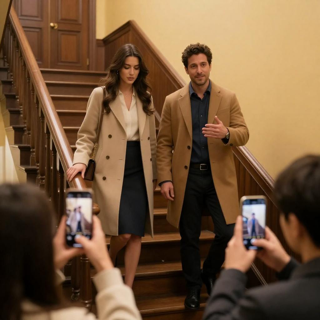 Photograph of a man and woman descending wooden stairs. Woman with long brown hair, light tan coat, dark skirt. Man with short dark hair, blue shirt, tan coat, gesturing with hand. Three people in foreground, holding smartphones, taking pictures. Warm yellow and brown wall background. Stairs and wooden door behind them. Woman looks down, man looks at camera.