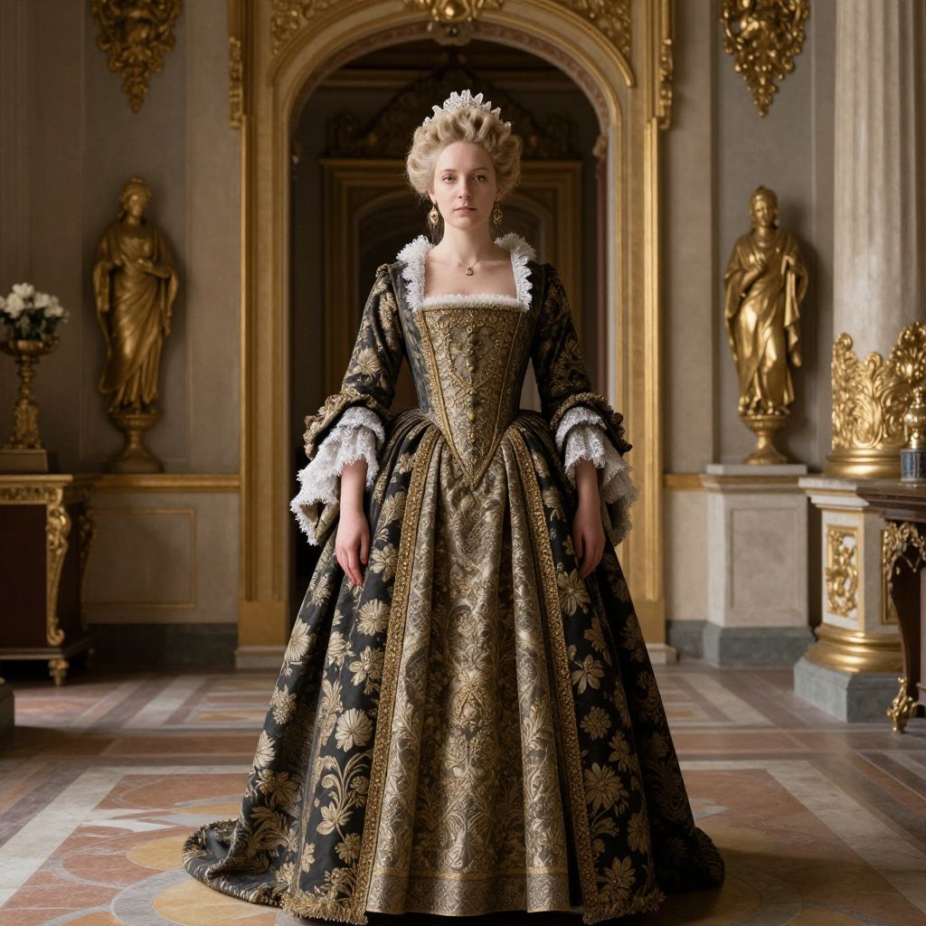 Photograph of a fair-skinned woman in an ornate, black and gold Baroque-style dress with white lace, standing in an opulent room