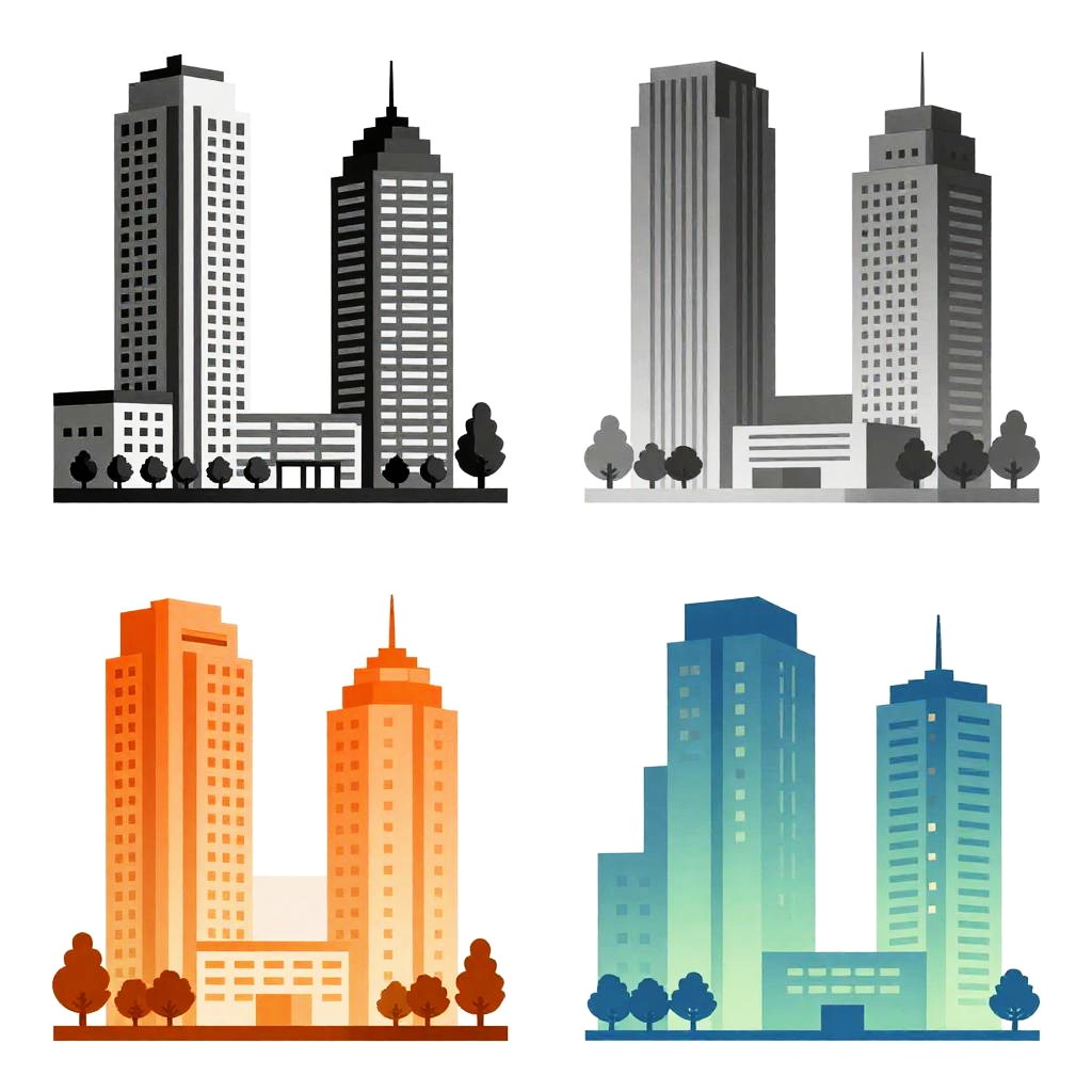 This image is a digital collage featuring four abstract, pixelated architectural drawings of modern buildings. Each building is depicted in a different style and color palette: black and white, grayscale with a tree, warm orange tones, and a gradient blue-green. The buildings are arranged in a 2x2 grid, each with unique textures and geometric patterns, creating a visually striking and modern aesthetic.