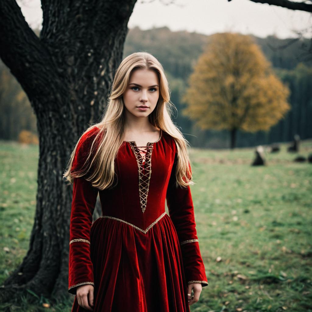 Medieval gold dress,1girl, solo, blonde hair, dress, realistic, blurry background, looking at viewer, jewelry, blurry, long sleeves, photorealistic, necklace