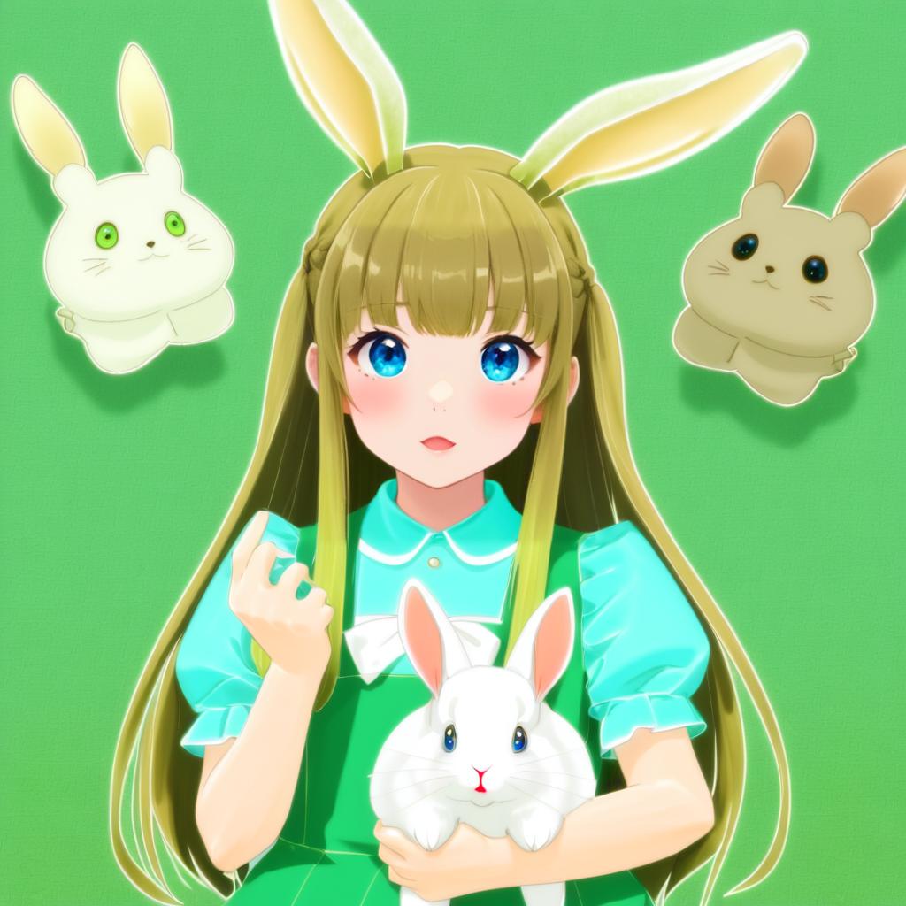 Digital anime-style illustration of a girl with long brown and blonde hair, striking blue eyes, and blunt bangs. She is wearing a turquoise dress with puffed sleeves and holding a white rabbit. The girl has large glowing rabbit ears on her head. Two floating bunny-shaped characters are present on either side of her against a green background. The art features a soft, smooth color palette and a whimsical, magical atmosphere.