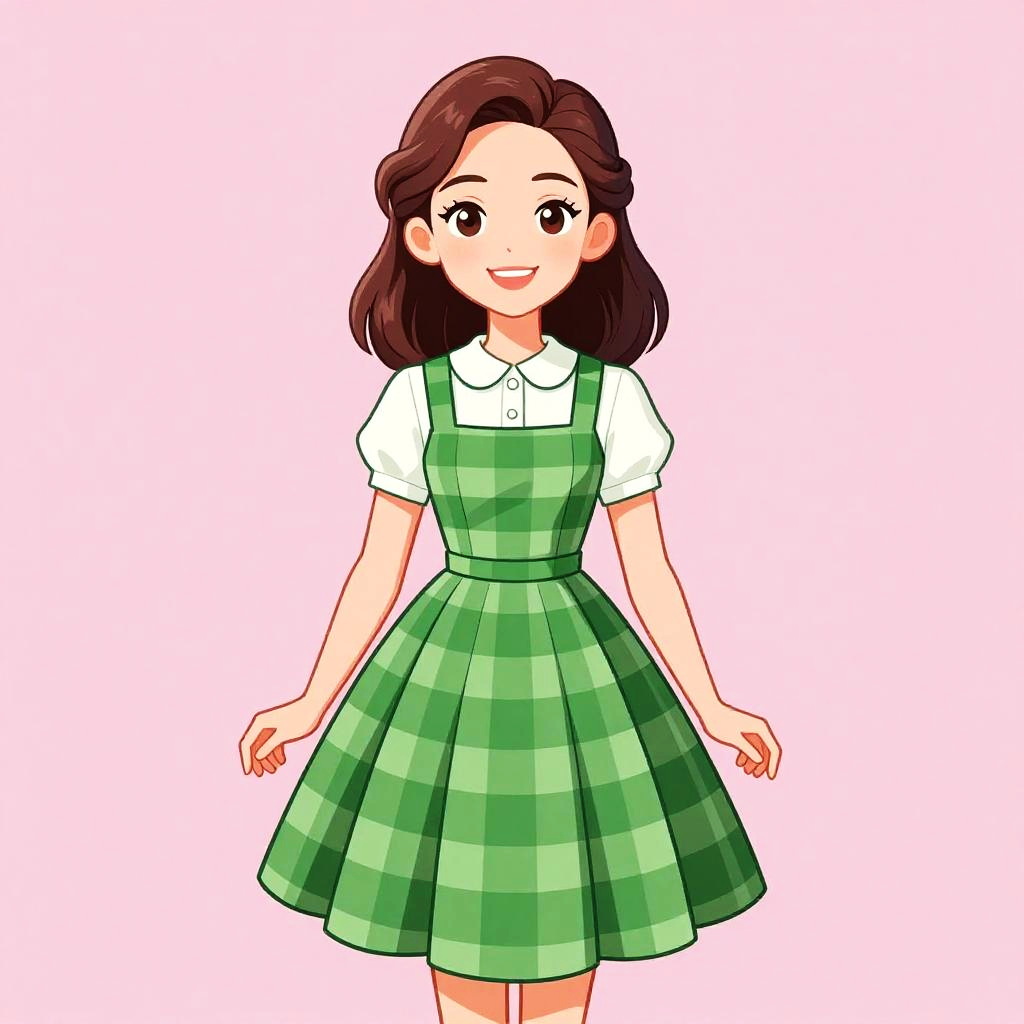 Digital anime-style drawing of a smiling young woman with brown hair, wearing a green plaid dress over a white shirt.