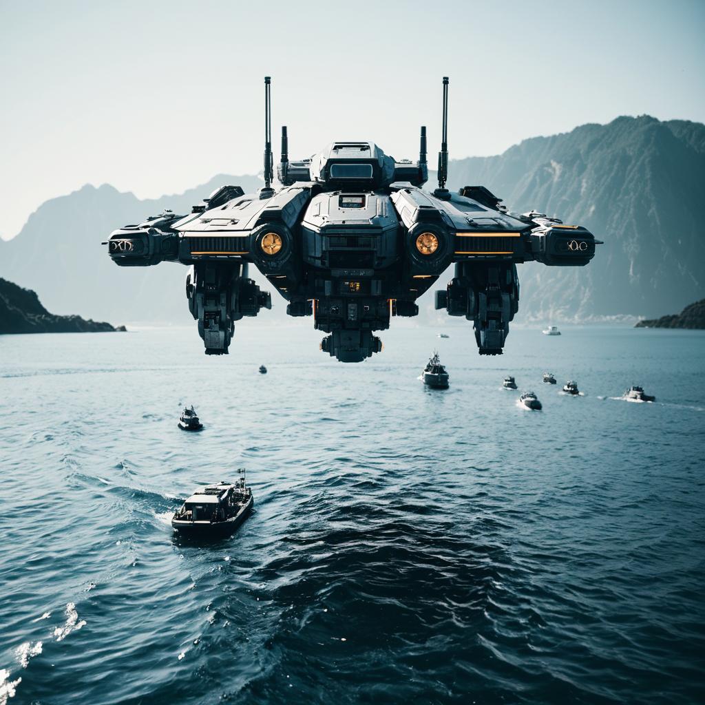Futuristic Sci-Fi Hovering Mech over Water