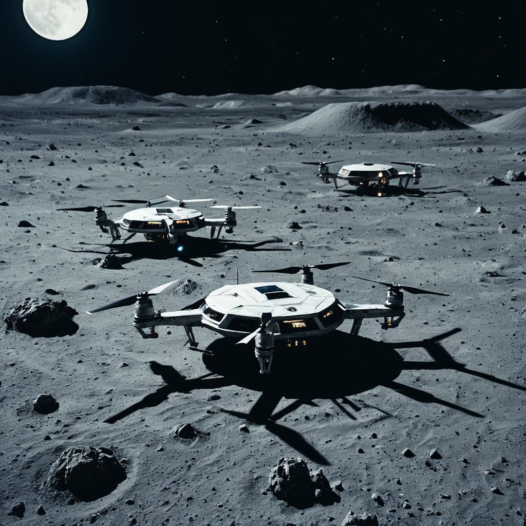 Sci-Fi mechs copy same product and create different floating futuristic islands. For technical details, use a Nikon D850 camera with a 50mm prime lens at f/2.8 aperture and ISO 200.