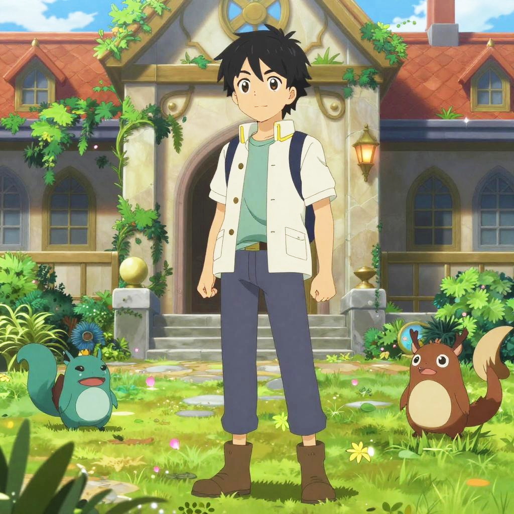 Iruma standing confidently in a magical academy courtyard, enchanted plants and friendly monsters around, lush greenery and ornate architecture, anime style with high detail and warm colors, a mix of fantasy and slice-of-life vibes.
