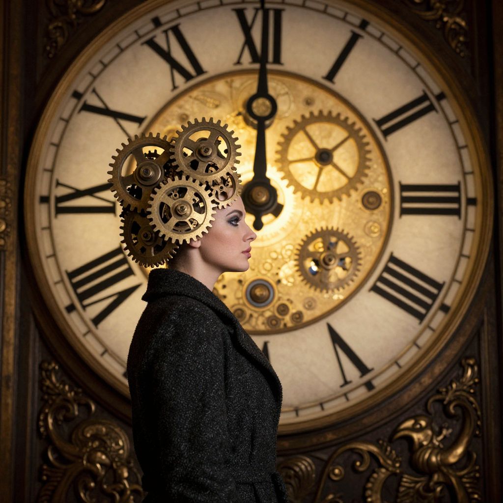 In the image, a woman with intricate mechanical gears adorning her hair stands in front of a large, ornate clock displaying the time 3:33. The clock's face is detailed with Roman numerals and a golden glow emanating from the center, creating a sense of timelessness and mystery. The woman's attire, a dark, textured coat, contrasts with the clock's elaborate design, adding depth to the composition. Her gaze is directed towards the clock, suggesting a connection between her and the passage of time. The overall scene is a blend of mechanical and natural elements, with the gears and clock representing the passage of time, while the woman's presence adds a human element to the scene. The interplay of light and shadow, along with the detailed textures of the clock and the woman's coat, creates a visually rich and dynamic image.