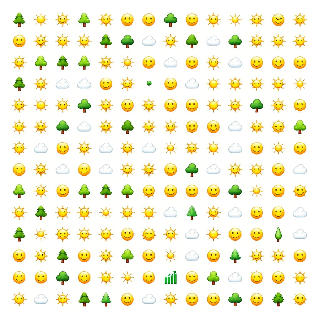 Convert image to emoji visualization, a landscape photo breaking down into small emoji icons representing elements like trees, sun, clouds, arranged in a grid, high contrast colors, surreal and imaginative digital art