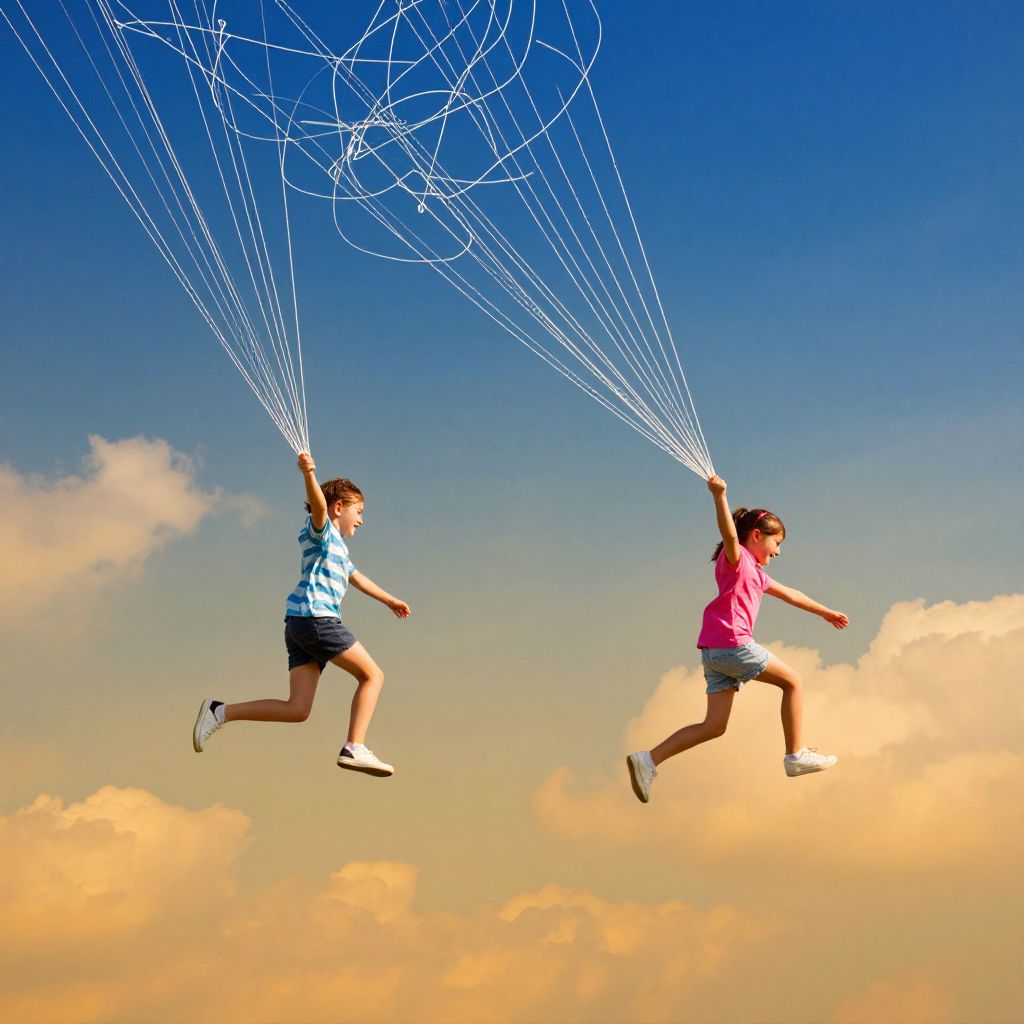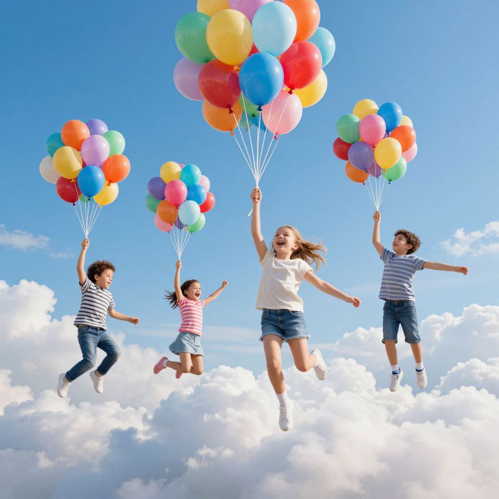 A child soars weightlessly among ethereal clouds, arms outstretched toward shimmering soap bubbles that dance through a radiant, dreamlike sky.