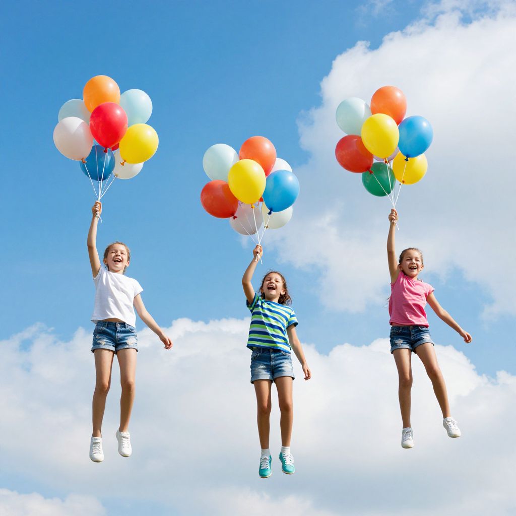 Photograph of a young girl with long brown hair, wearing a white t-shirt, blue denim shorts, and gray sneakers, joyfully jumping with arms outstretched against a bright blue sky. Large, translucent soap bubbles float around her, casting faint rainbow reflections. The background features fluffy white clouds and a sunlit sky, creating a vibrant, airy atmosphere. The girl is captured mid-air, emphasizing a sense of freedom and playfulness.
