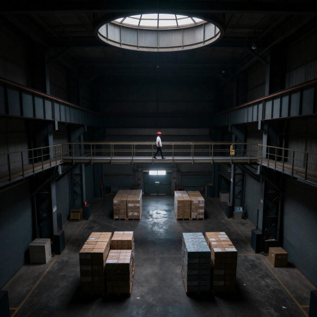 Aerial photograph of a dimly lit industrial warehouse with a circular ceiling. A person in a red hat and white shirt walks along a catwalk above stacked boxes. Bright light illuminates the center. Dark, complex metal structures surround the scene.