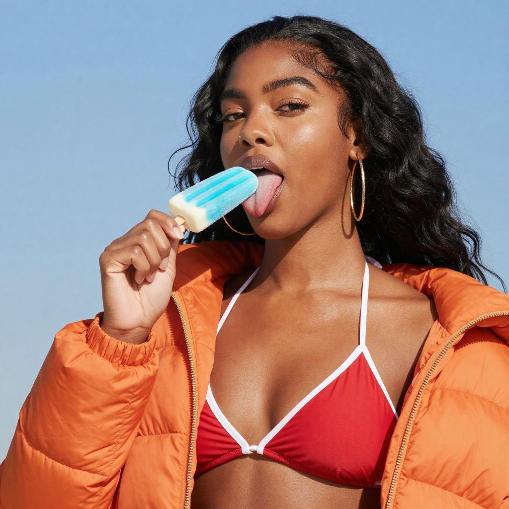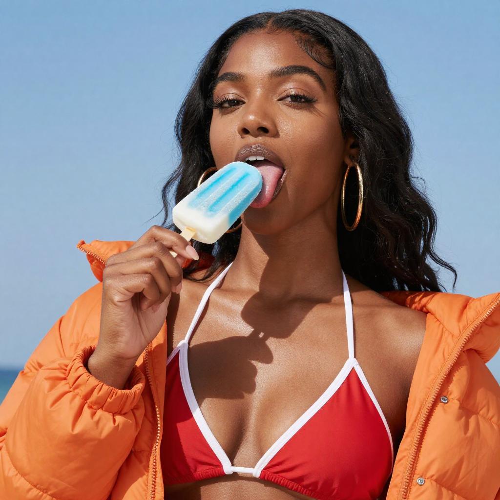 Photograph of a dark-skinned woman with long black hair, wearing a red bikini top with white trim and an orange puffer jacket. She is licking a blue and white popsicle, her tongue extended. She has large gold hoop earrings and is looking at the camera with a playful expression. Bright blue sky background.