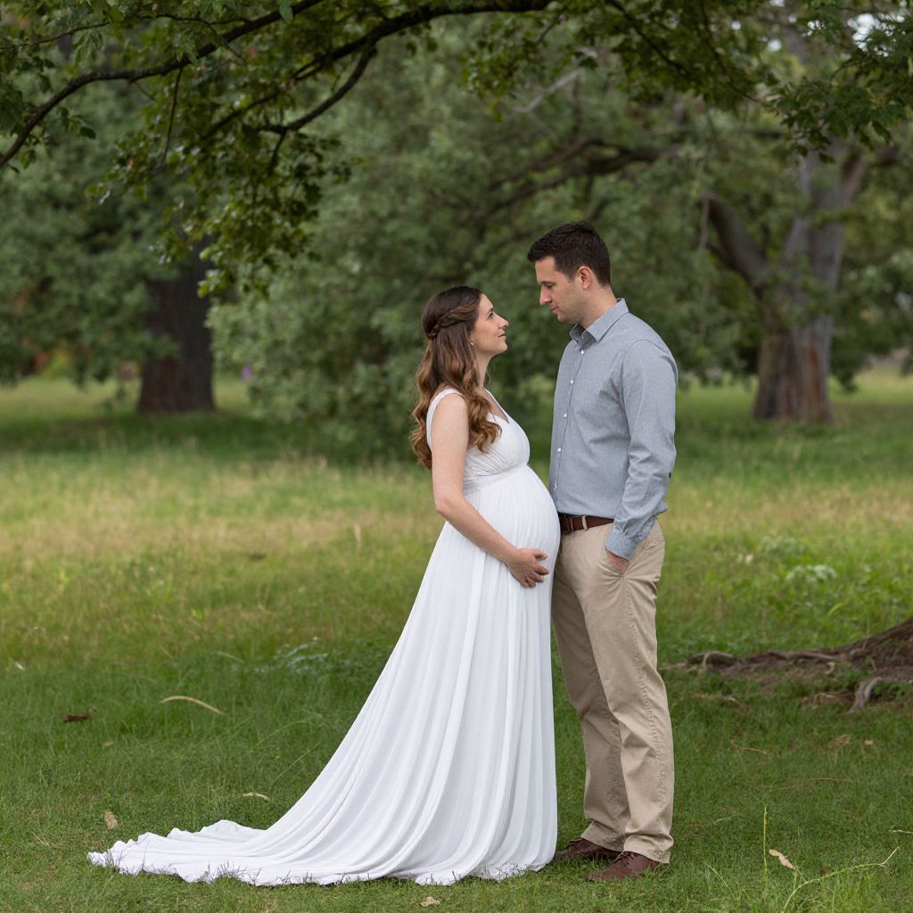 Photograph of a pregnant couple standing in a lush green park, with the woman in a white dress and the man in light blue shirt and khaki