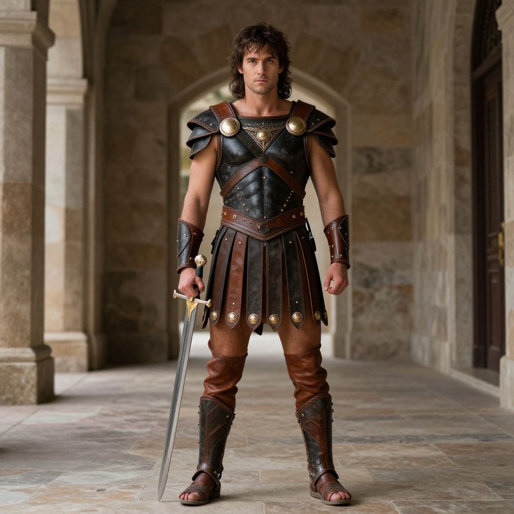 Photorealistic CGI of a muscular, dark-haired, Caucasian male warrior standing in a stone hallway. He wears a black leather armor with gold accents, brown leather skirt, and sandals. His arms are adorned with matching bracers, and he holds a sword in his right hand. The background features arched doorways and stone pillars, casting soft shadows. His intense gaze and confident stance evoke a sense of readiness and strength. The colors are earthy, with the stone walls in various shades of brown and the leather in dark browns and blacks.