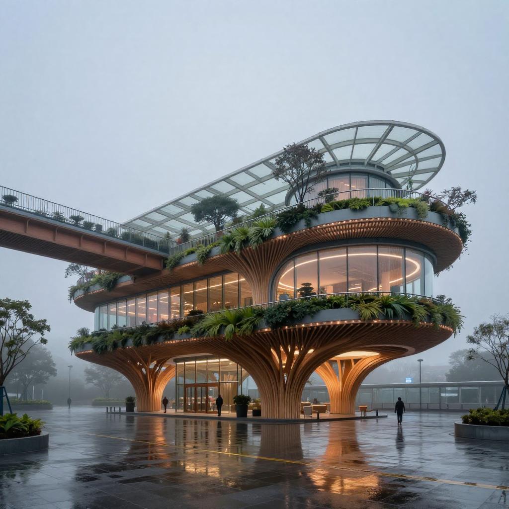 RAW photo, floating botanical transit hub exterior with terraced platforms, glass-walled boarding concourses and planted skybridges, sinuous timber ribs and laminated wood lattice, translucent ETFE canopy, integrated living green walls and warm copper accents — in the spirit of Kengo Kuma and Alejandro Aravena, pre-dawn mist with cool blue ambient light, warm interior glows bleeding through the fog, overcast white sky, wet plaza reflections, open plaza foreground, architecture photography, hyper realistic, super detailed, 8k, Canon EOS R5, 16mm ultra-wide, handheld, tilt-shift correction, long exposure, true verticals, clean lines, sharp reflections, calibrated white balance, subtle film grain, HDR bracketed, crisp edges, minimal signage