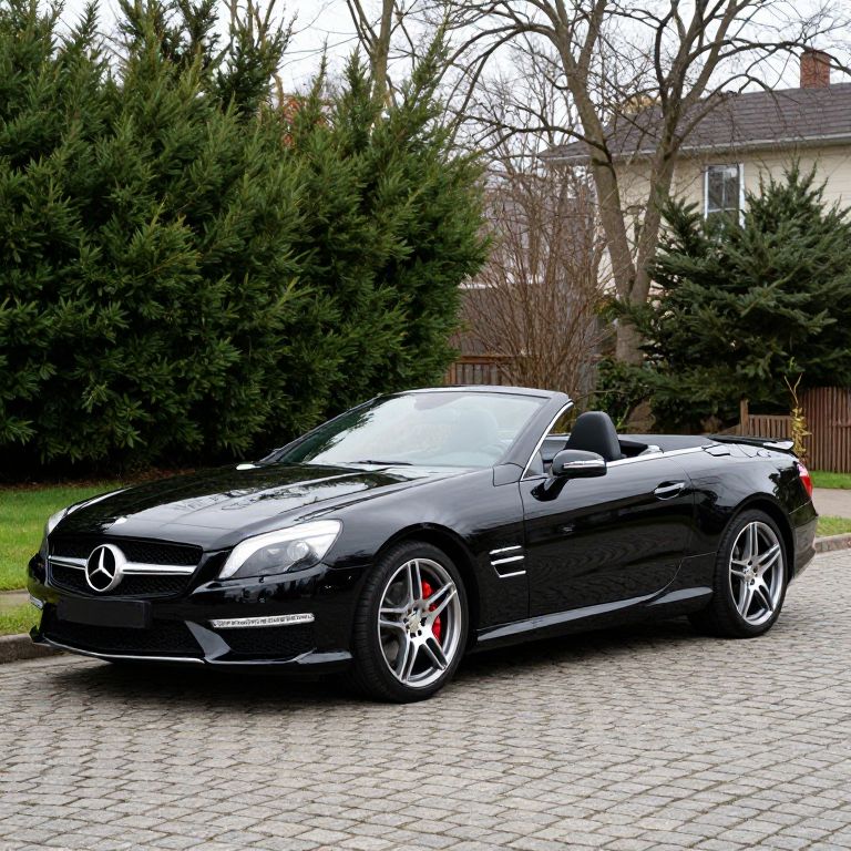 Photograph of a sleek, black Mercedes-Benz convertible with a shiny finish, parked on a cobblestone driveway. The car features silver alloy wheels, red brake calipers, and a prominent silver Mercedes emblem on the front grille. Its top is down, revealing a black interior. In the background, there are tall, dense evergreen bushes and a leafless tree, with a suburban house partially visible behind them. The sky is overcast, casting a soft light over the scene. The car's design is modern and sporty, with sharp lines and a low profile.