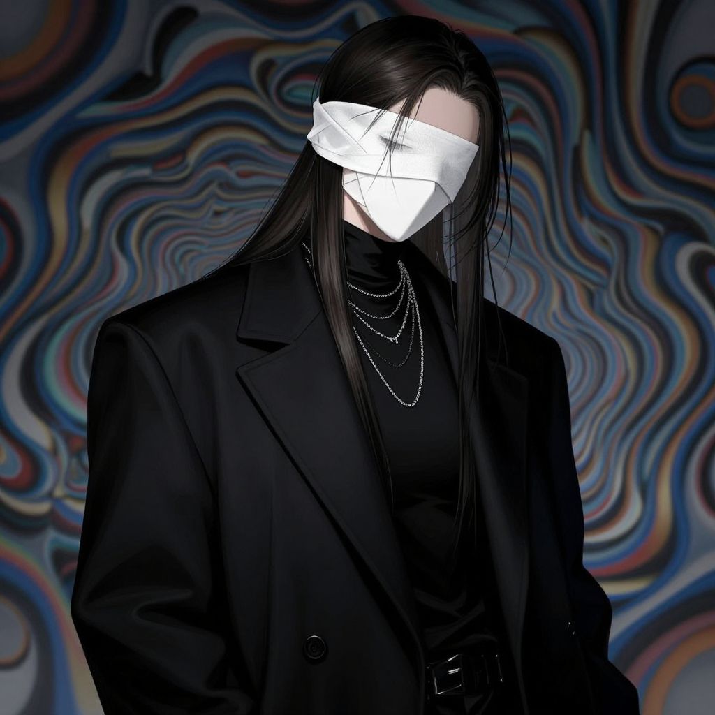 Ultra-detailed digital illustration in a contemporary high-fashion style, featuring a mysterious androgynous figure positioned slightly off-center, their head tilted downward with their mouth partially obscured by a stark white bandage that creates a striking focal point, Long, straight dark hair cascades over their shoulders, its sleek texture contrasting sharply with the crisp, clean white of the bandage, The figure is draped in an oversized black coat with dramatically voluminous shoulders, its sleek, polished texture hinting at luxurious fabric, possibly wool or cashmere, Beneath the coat, a barely visible black, high-necked top adds subtle depth, while delicate, layered silver chains adorn their neck, infusing an edgy, modern elegance, The background is a surreal blend of vivid optical illusion patterns, twisting and spiraling in kaleidoscopic shapes, creating a psychedelic effect that distorts perception and enhances the figure’s enigmatic presence, Dim, atmospheric lighting casts soft shadows, heightening the noir-inspired mood, The overall palette is rich and moody, with the white bandage as the sole bright element, pulling focus to the figure's rebellious aura, Smooth, precise lines and a polished finish define the artwork, capturing the essence of avant-garde fashion with a narrative of secrecy, defiance, and surreal intrigue