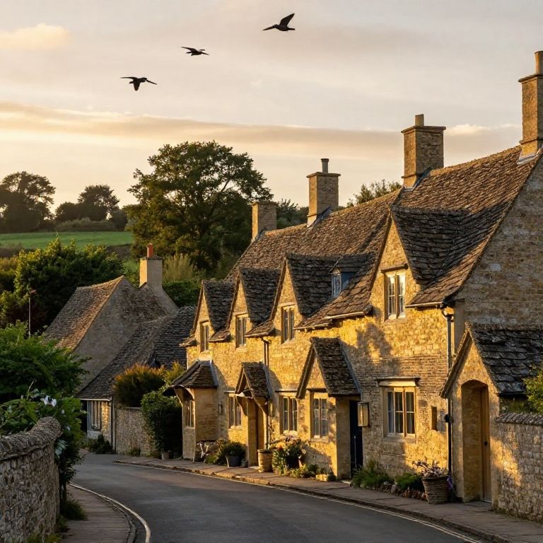 Photograph of a quaint, sunlit English village featuring a row of charming, beige stone cottages with steep, shingle roofs and chimneys. The cottages have small, arched wooden doors and windows with white frames. A narrow, curved road winds through the village, bordered by a stone wall on the left. In the background, lush green trees and rolling hills are visible under a golden sunset sky. Two birds are flying overhead, adding a sense of tranquility. The cottages and road are bathed in warm, late-day light, creating a picturesque, idyllic scene.