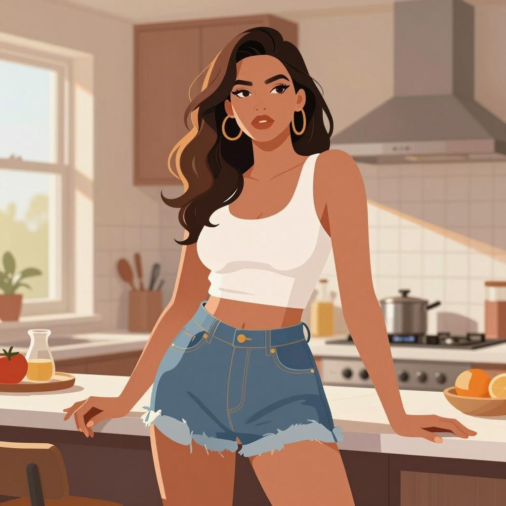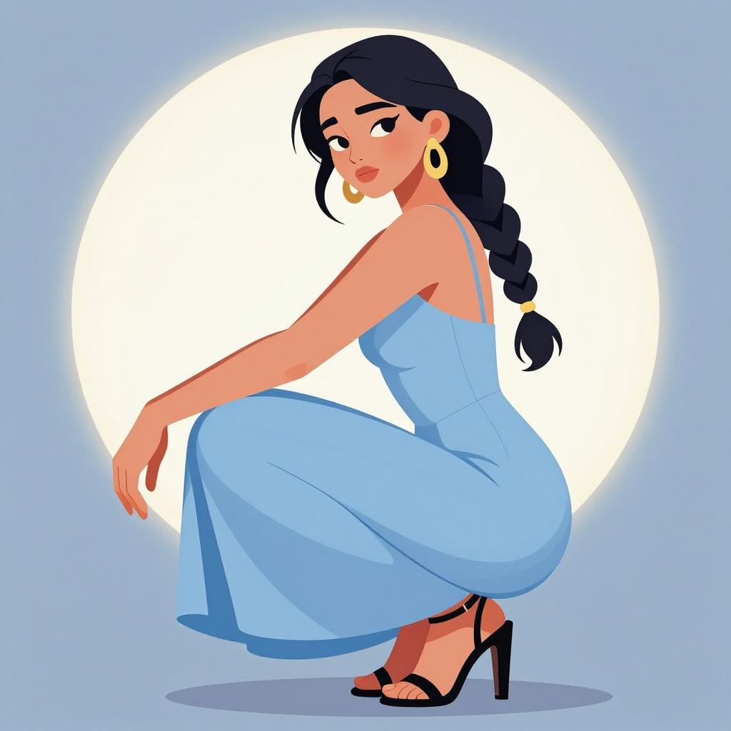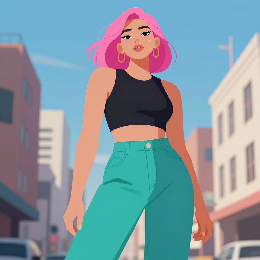 This vibrant digital illustration features a confident woman with long, flowing hair, dressed in a stylish, form-fitting outfit. Her bold colors and dynamic pose capture a sense of modern urban fashion, making it an eye-catching piece of contemporary art.