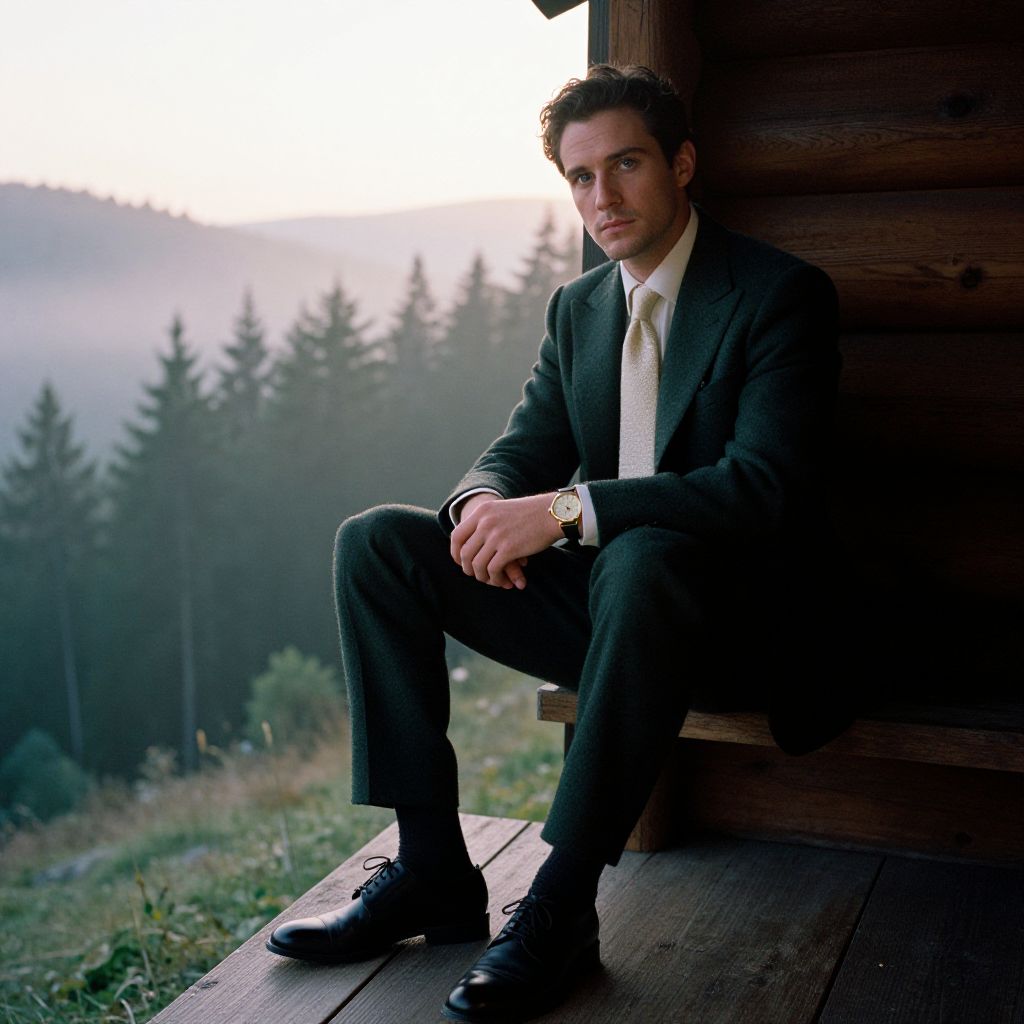 A man, dark green wool-blend suit, ivory dress shirt, textured silk tie, black leather derby shoes, elegant gold dress watch, mountain-view wooden cabin, misty sunrise glow, serene pine forest backdrop, Ilford film stock, contemplative expression. Man has masculine face and piercing eyes