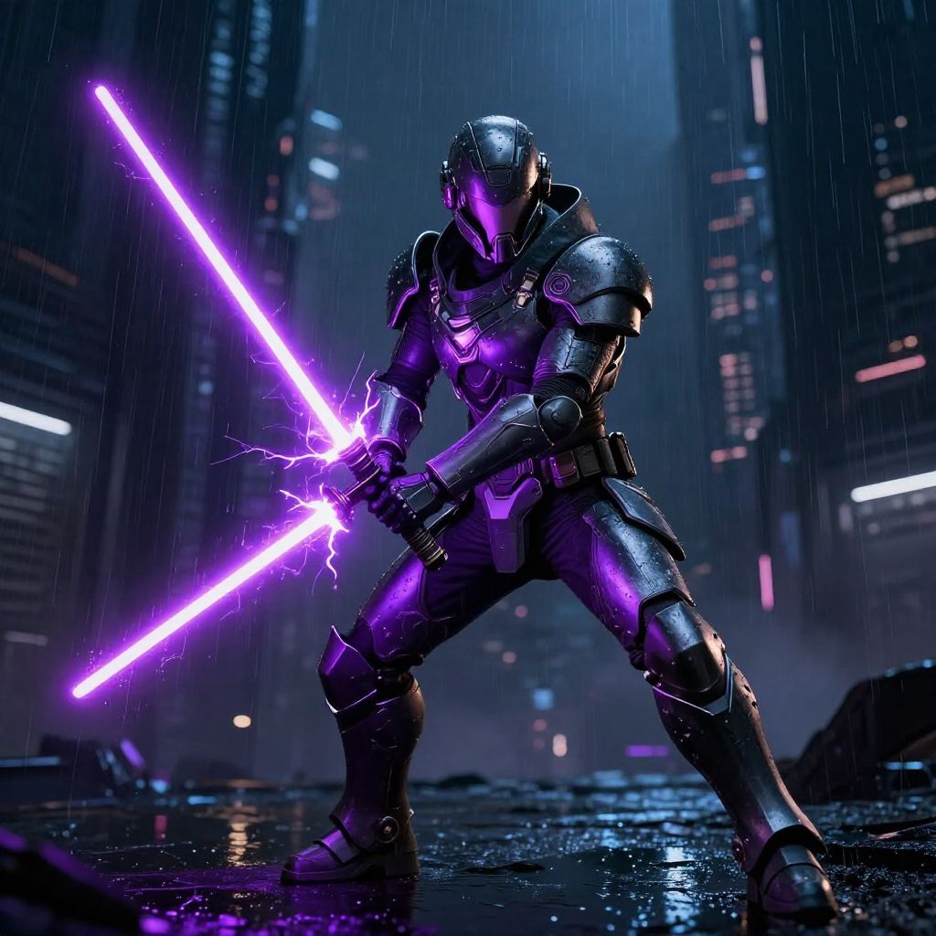 A claymore lightsaber held by a futuristic warrior, crackling neon purple blade, dark cyberpunk cityscape at night, rain reflections, highly detailed armor and weapon