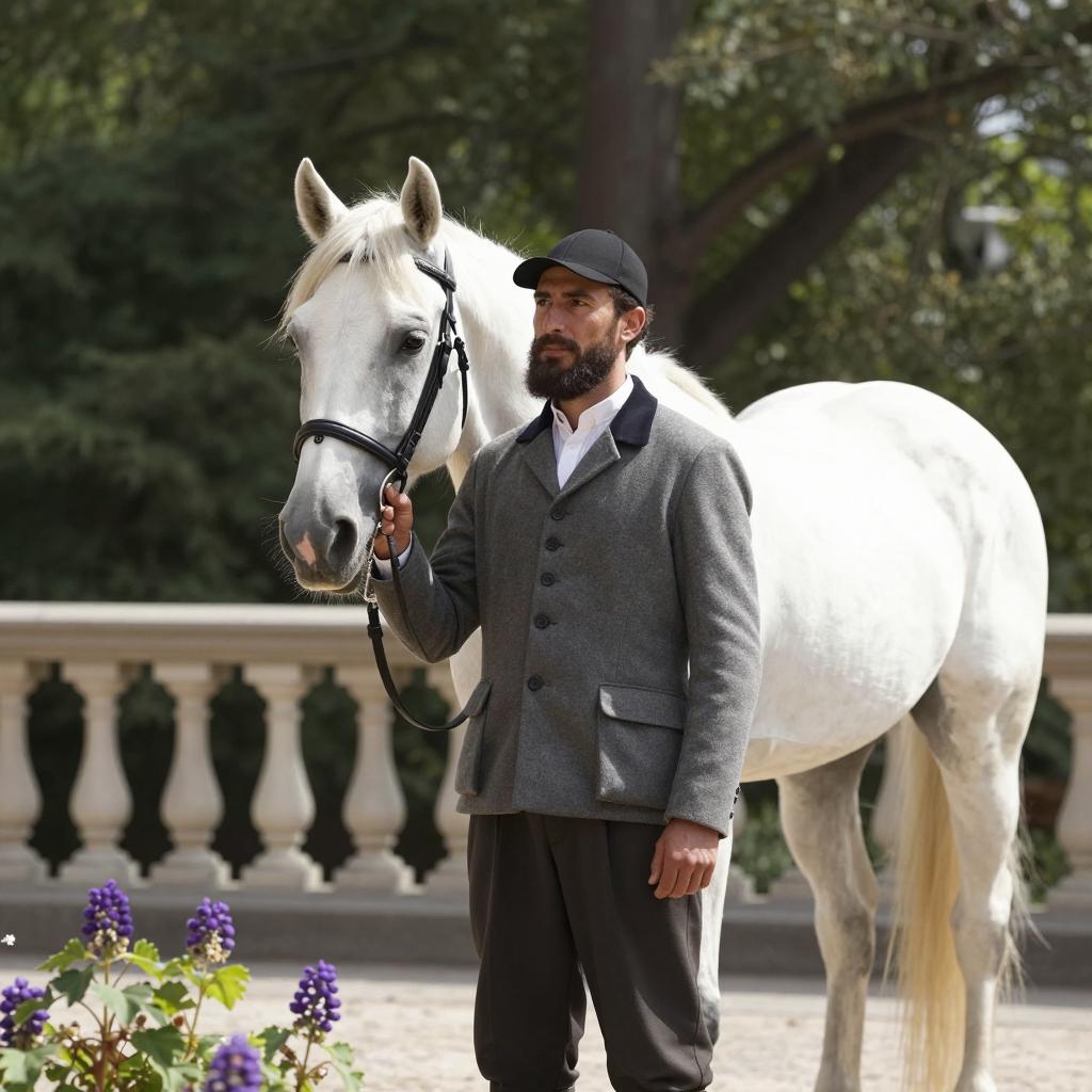 Photograph of a bearded man wearing a black cap, grey jacket, and dark pants standing beside a white horse with a bridle. The man holds the horse's bridle with his right hand. The background features lush green trees and a stone balustrade, with purple flowers and green leaves in the foreground. The scene is illuminated by natural sunlight.