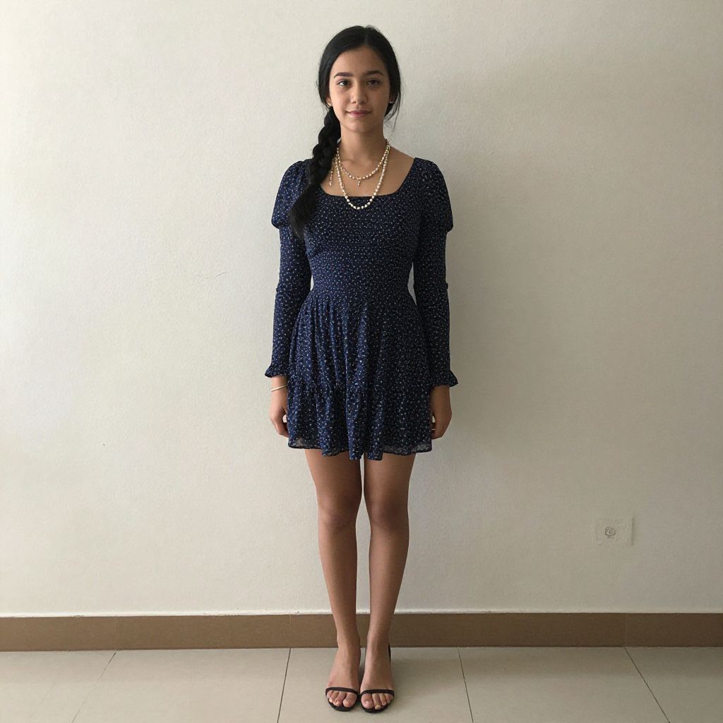 Photograph of a young woman standing against a plain white wall with a beige baseboard. She has medium-length black hair in a side braid, wearing a dark blue, long-sleeved, knee-length dress with a slight flare and subtle polka dot pattern. She accessorizes with a gold necklace and black open-toed sandals. Her skin tone is light brown, and she stands with a neutral expression, slightly smiling. The floor is light-colored tile. The overall lighting is bright, highlighting her figure and the simple, minimalistic background.