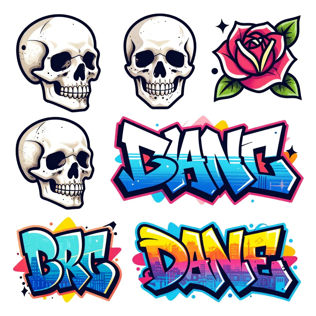 Graffiti new school tattoo outline drawings mixing bold, sharp linework with playful, modern tattoo designs, including skulls, roses, and graffiti tags, enhanced by vivid color gradients and urban scenery.