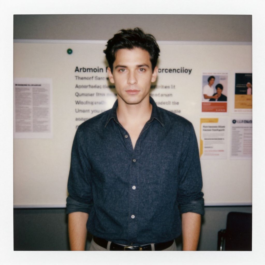 Photograph of a young Caucasian man with short, dark curly hair and fair skin, standing in front of a whiteboard with text and small images. He has a serious expression, brown eyes, and is wearing a dark blue, slightly worn, button-down shirt with the top buttons undone, and dark pants with a black belt. The background includes a whiteboard with black text, a small green square, and multiple colorful images and documents. The lighting is even, and the overall atmosphere is professional. The image has a white border.