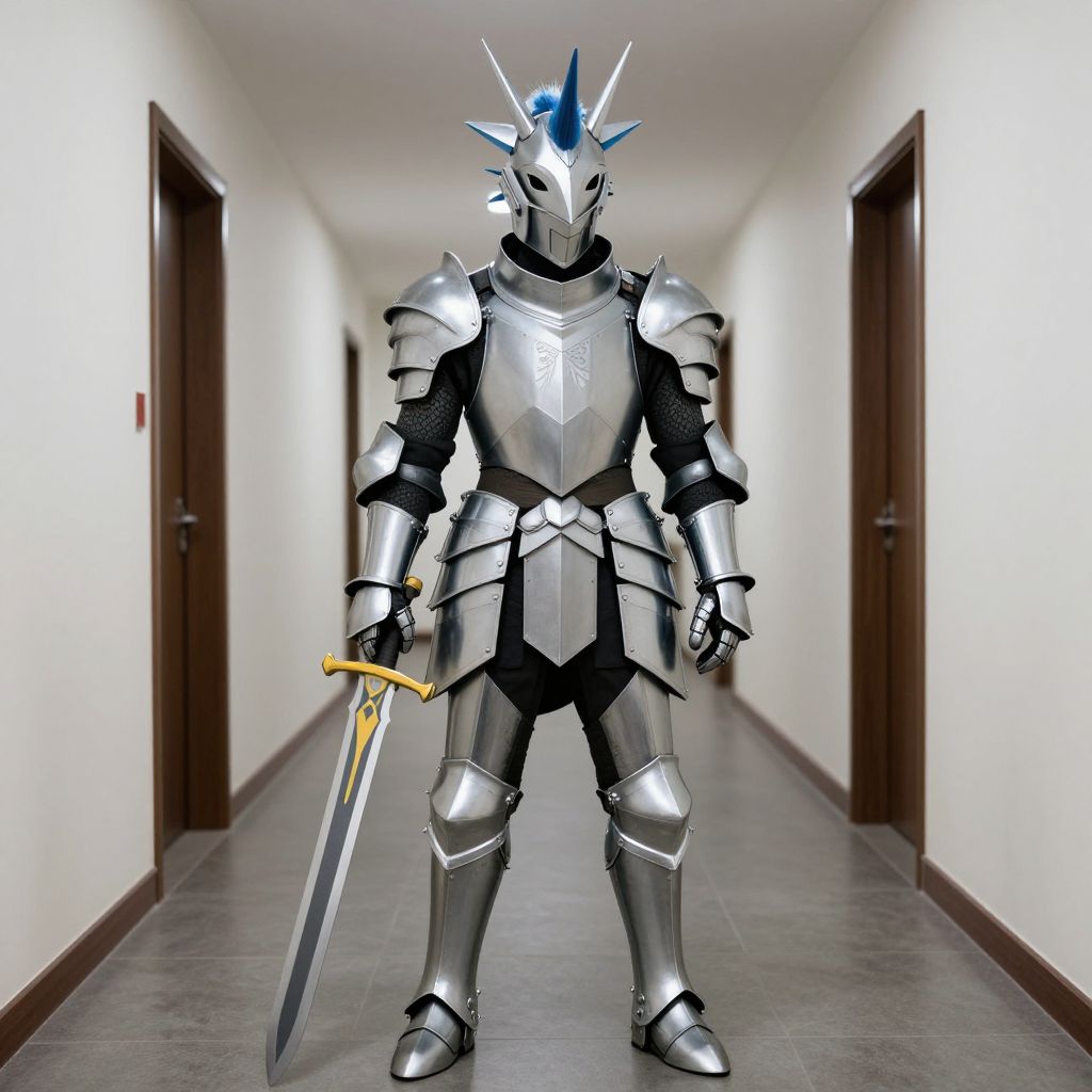 Photograph of a silver knight in metallic armor with blue horned helmet, standing in a white hallway with wooden doors. Holding a silver sword with yellow