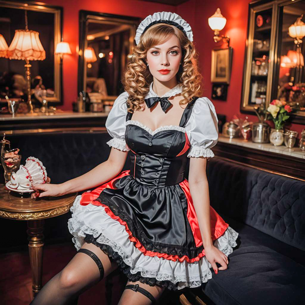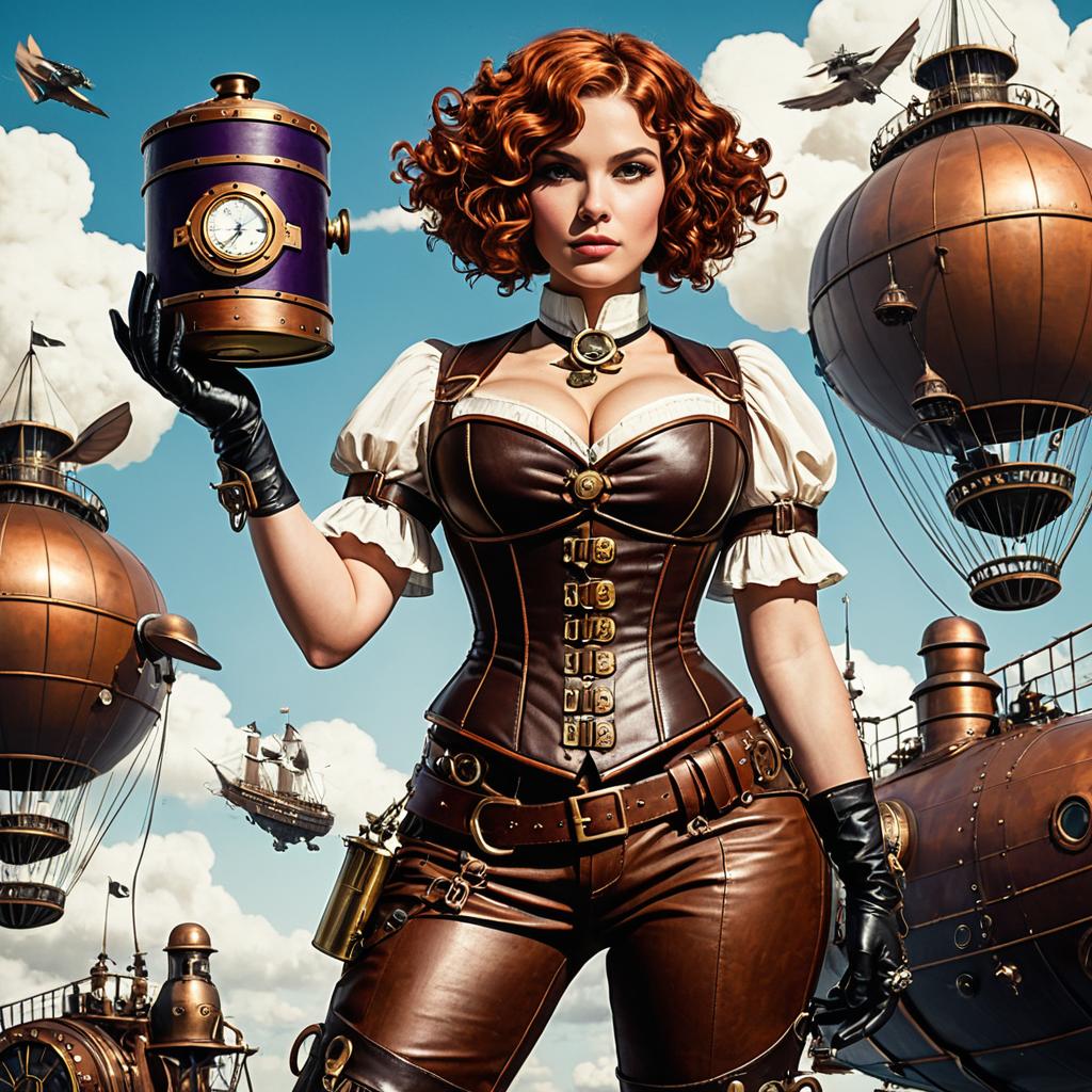 Cartoon illustration of a retro pinup robot girl, with neon pink robotic curls, electric blue eyes, wearing chrome and polka-dot dress with thigh-high stockings, vintage futurism, with revealing extra-large cleavage, holding a spraypaint can, set against a retro diner interior, stylish and original.