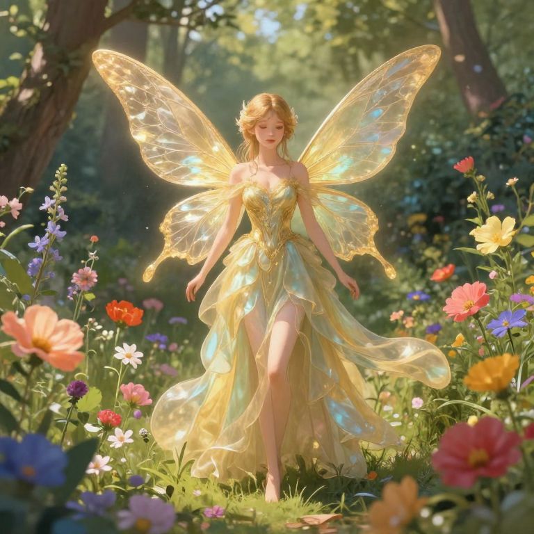Digital illustration of a radiant, blonde fairy with glowing wings, wearing a golden, translucent dress, walking through a sunlit, colorful garden.