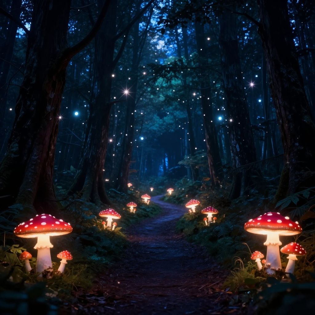 Fantasy forest scene featuring a winding path illuminated by glowing red and white spotted mushrooms among tall trees. The night sky is filled with sparkling lights and luminous orbs, creating an enchanting, magical atmosphere.