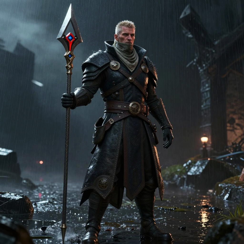 Photorealistic digital art: muscular male warrior with spiked hair, detailed silver armor, and sword, standing in a sunlit, ruined, ancient temple