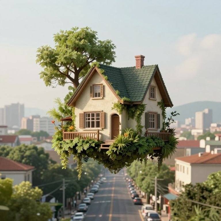 Suspended above the mundane streets below, a whimsical house floats serenely on a bed of greenery, embodying the quiet rebellion of dreams against gravity, where laughter and wonder defy the weight of reality.