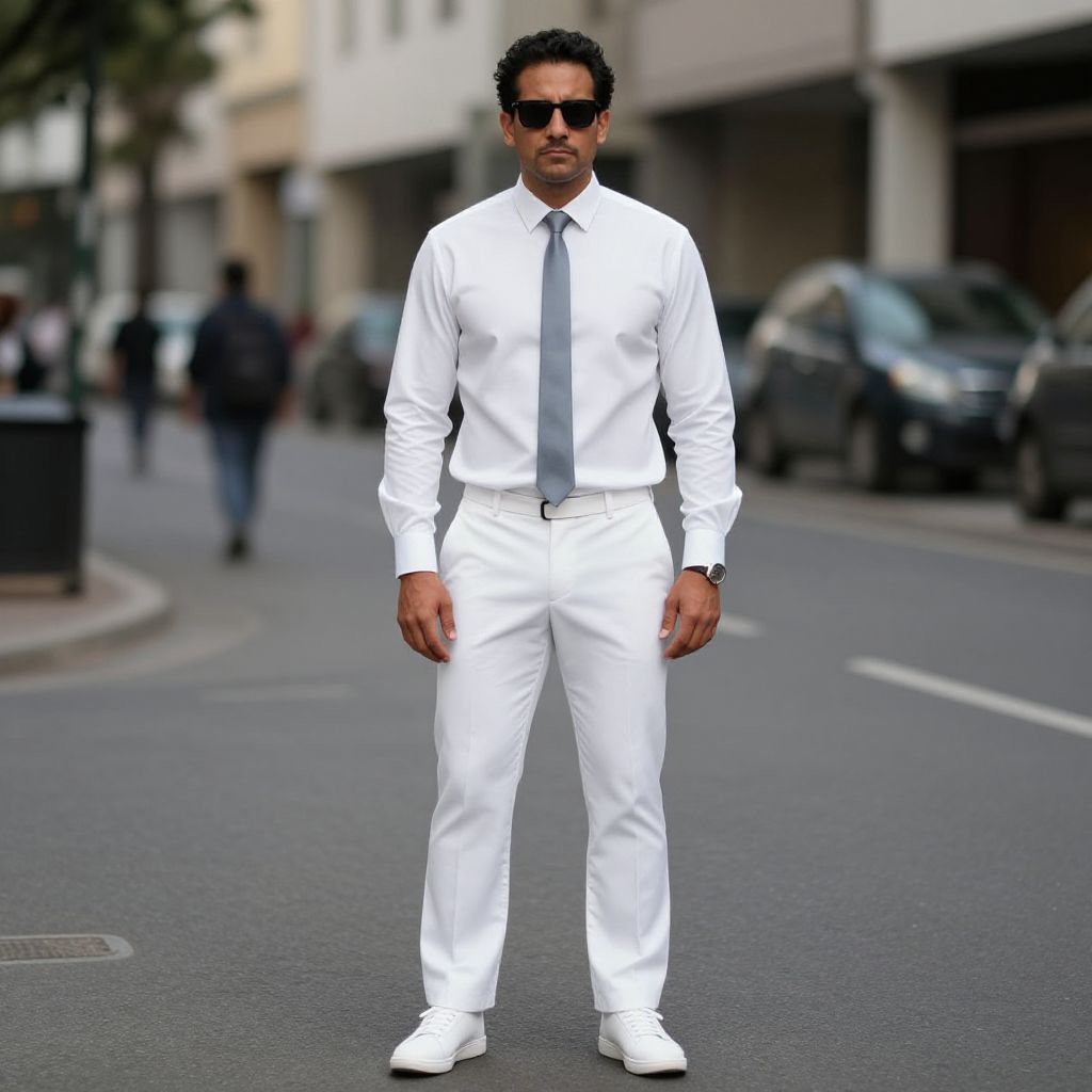 Photograph of a confident, dark-skinned man with short, curly black hair, wearing dark sunglasses, a crisp white dress shirt, white tie, and white pants. He completes his outfit with white shoes and a black watch. He stands in the middle of a city street with blurred parked cars and buildings in the background. The street is paved with gray asphalt, and there are pedestrians in the distance. His posture is upright and assertive, conveying a stylish and modern urban look. The overall color palette is dominated by white, contrasting with the darker background.