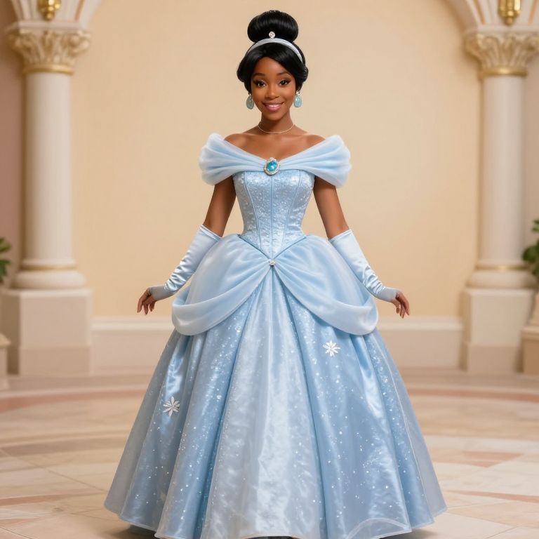 A digital CGI image of a dark-skinned woman with an elegant, hourglass figure, wearing a light blue, off-the-shoulder, ball gown with a sparkling, full skirt and puffed sleeves. Her hair is styled in a high bun, adorned with a white headband. She has blue earrings and a matching blue gemstone at the center of her gown's neckline. The background features a softly lit, ornate, classical architectural setting with beige walls and white columns. Her expression is confident and poised, standing with arms slightly outwards. The overall style is reminiscent of a fairy tale princess.