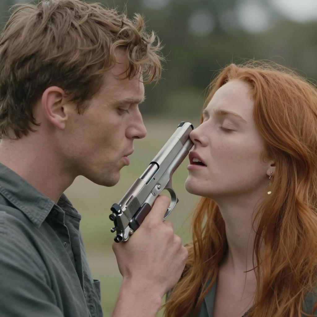 Two people in a dimly lit, graffiti-covered room. A blonde man with messy hair, wearing a gray t-shirt, gestures with his right hand. A red-haired woman with loose hair, wearing a black strap top, looks at him with intense eyes. Both are in mid-conversation, facing each other. The background includes colorful graffiti and a ladder.