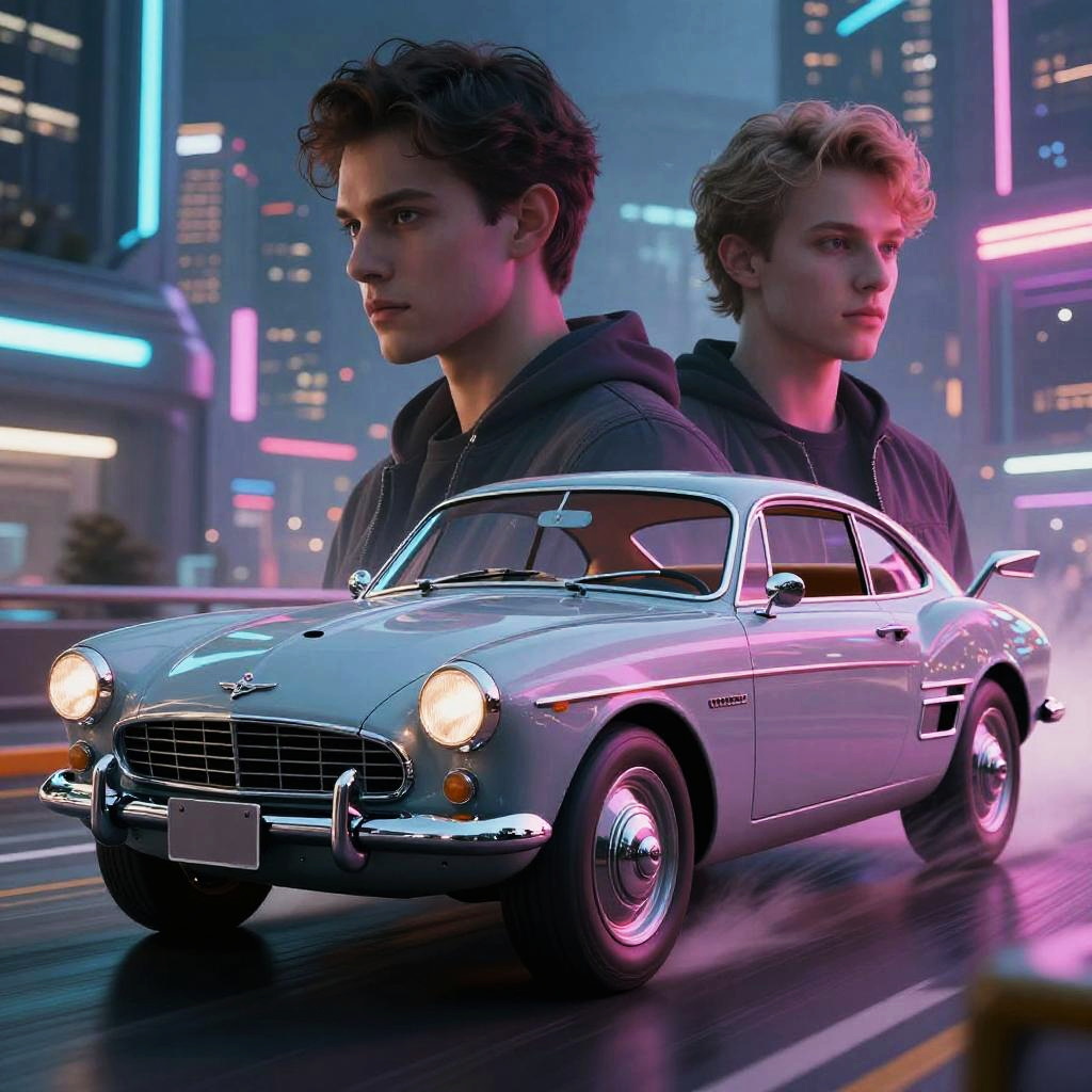 AI morph two images of a vintage classic car merging into a sleek, futuristic hover vehicle, dynamic transformation effect, neon lighting, sci-fi city backdrop, vibrant contrast, ultra-realistic rendering, photorealistic style, high definition.