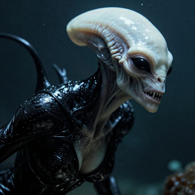 Hyperrealistic depiction of an otherworldly white alien female creature with a monstrous appearance. The figure features glossy black fractal leather-like skin texture, pronounced sharp teeth, large black eyes, and a slithery, slimy surface. The creature is set in a deep-sea, moody environment with a shallow depth of field, vignette, and bokeh effects highlighting its epic and cinematic presence.