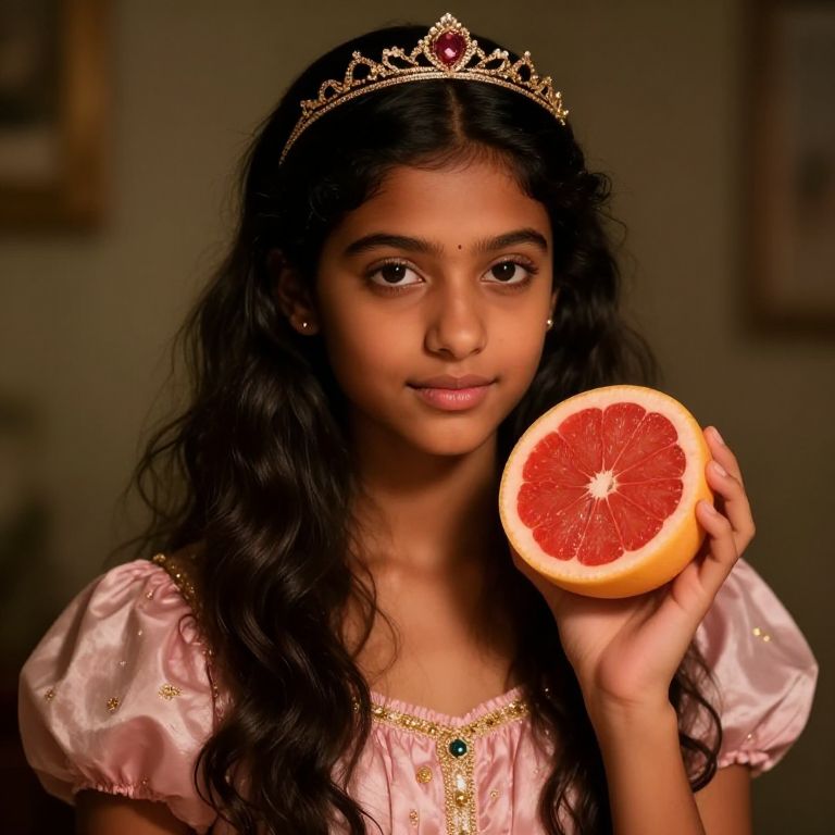 Consumerism Brown teen girl of South Asian descent holding a grapefruit. Fantasy fanart. Concept art. Princesscore. Royalcore. Fairy tale aesthetic. Cinematic lighting. Highly intricately detailed.,