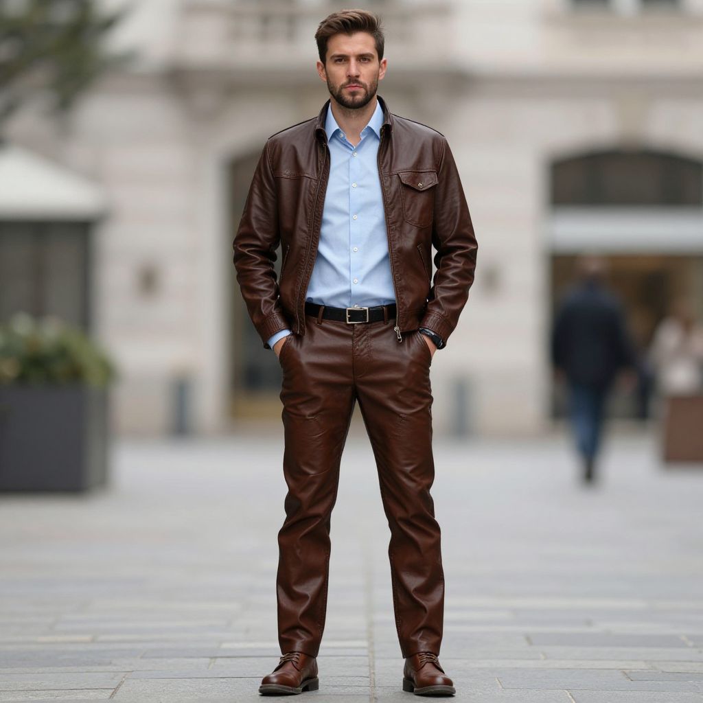 Photograph of a handsome, bearded man standing confidently in an urban setting. He has short, dark brown hair and a light complexion. He wears a fitted, dark brown leather jacket over a light blue dress shirt, paired with dark brown trousers and black leather shoes. His hands are in his pockets, and he stands with a relaxed posture. The background is slightly blurred, featuring a stone building with large windows and some indistinct pedestrians. The ground is paved with gray tiles, and there are potted plants to the left. The overall style is modern and stylish.