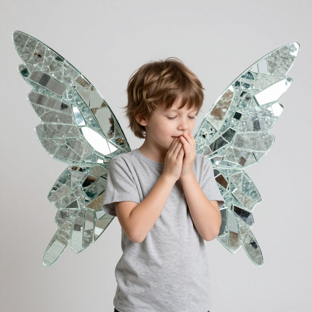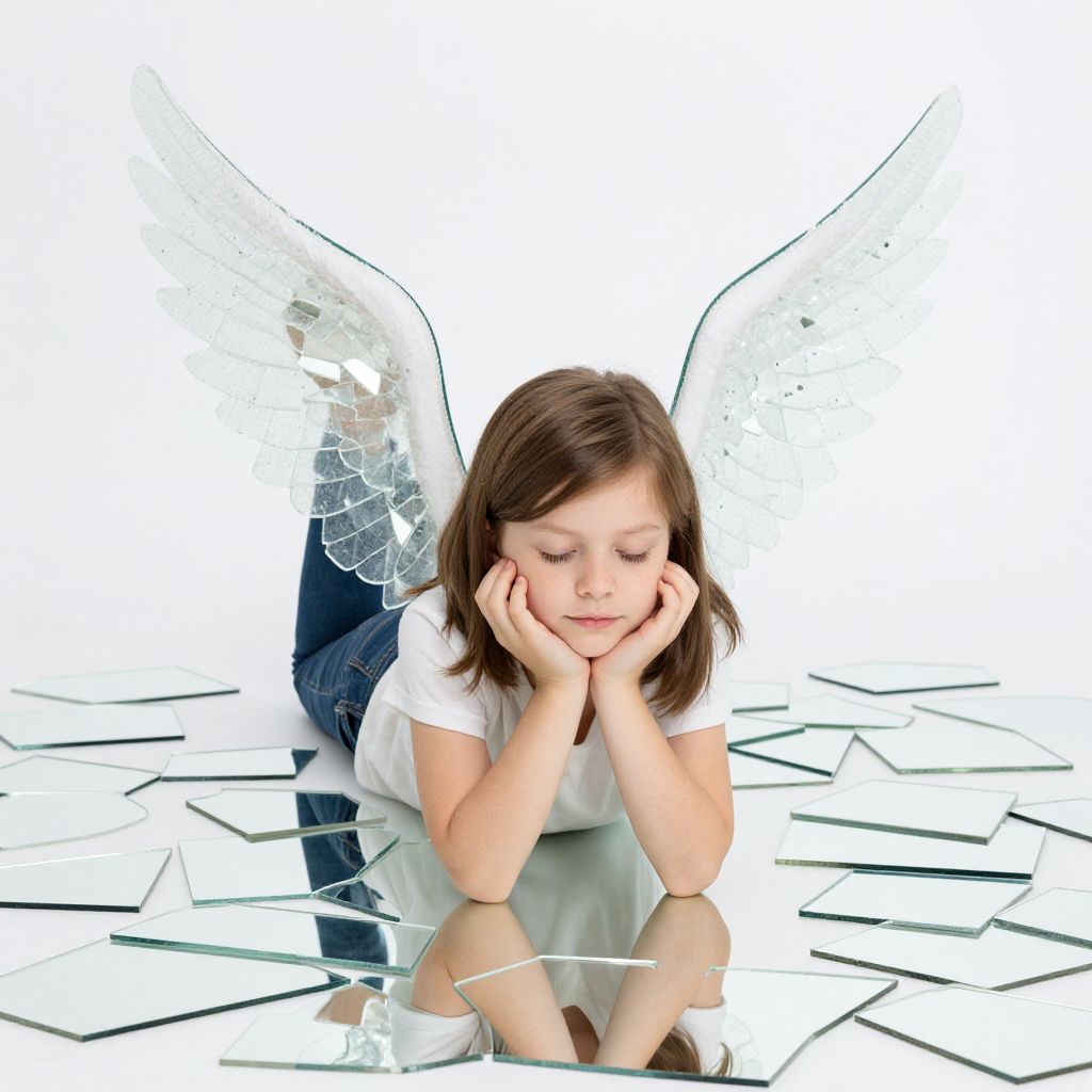 A child lies serenely amidst a scattering of shattered mirrors, their hands cradling their chin as if pondering the impossible—wings of fragmented glass rise behind them, defying gravity and reality alike.