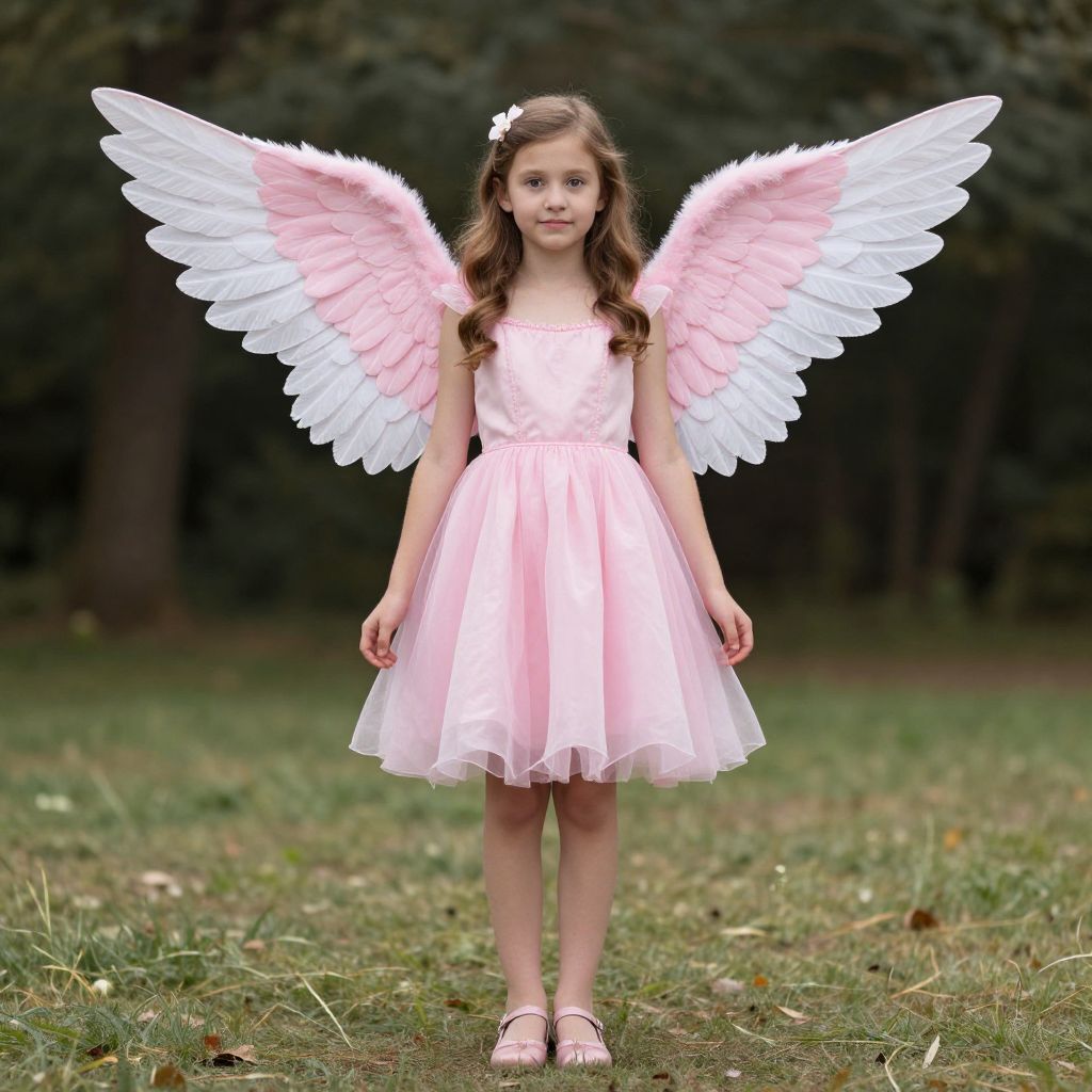 Photograph of a young girl with brown hair, white wings, and denim shorts, lying on a reflective glass surface, hands resting on her cheeks,