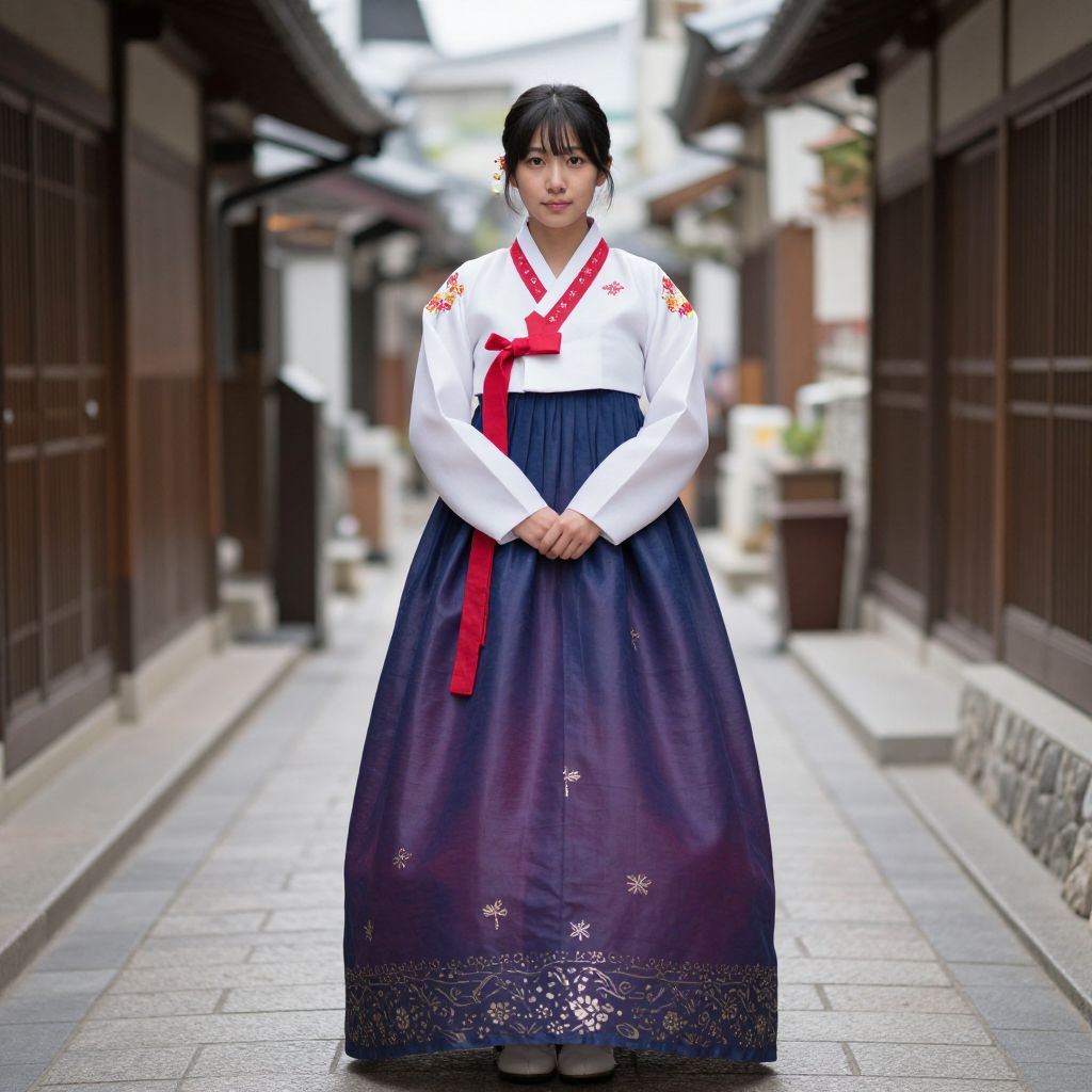 Satsuki Costume, woman in a hanbok standing in a narrow alley