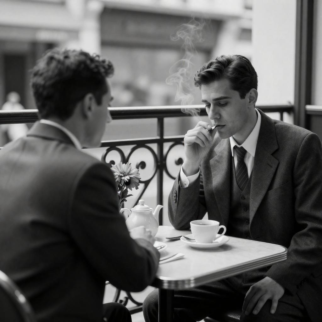 Photograph of a man in a blue suit, black bow tie, and gray fedora, smoking a cigarette, with intense green eyes. He sits at a table with a newspaper. In the background, a bald man in a brown suit serves drinks to other patrons. The setting is a dimly lit bar with a menu board above. Multiple people, warm lighting, casual attire.