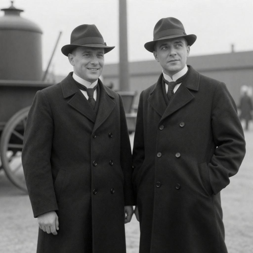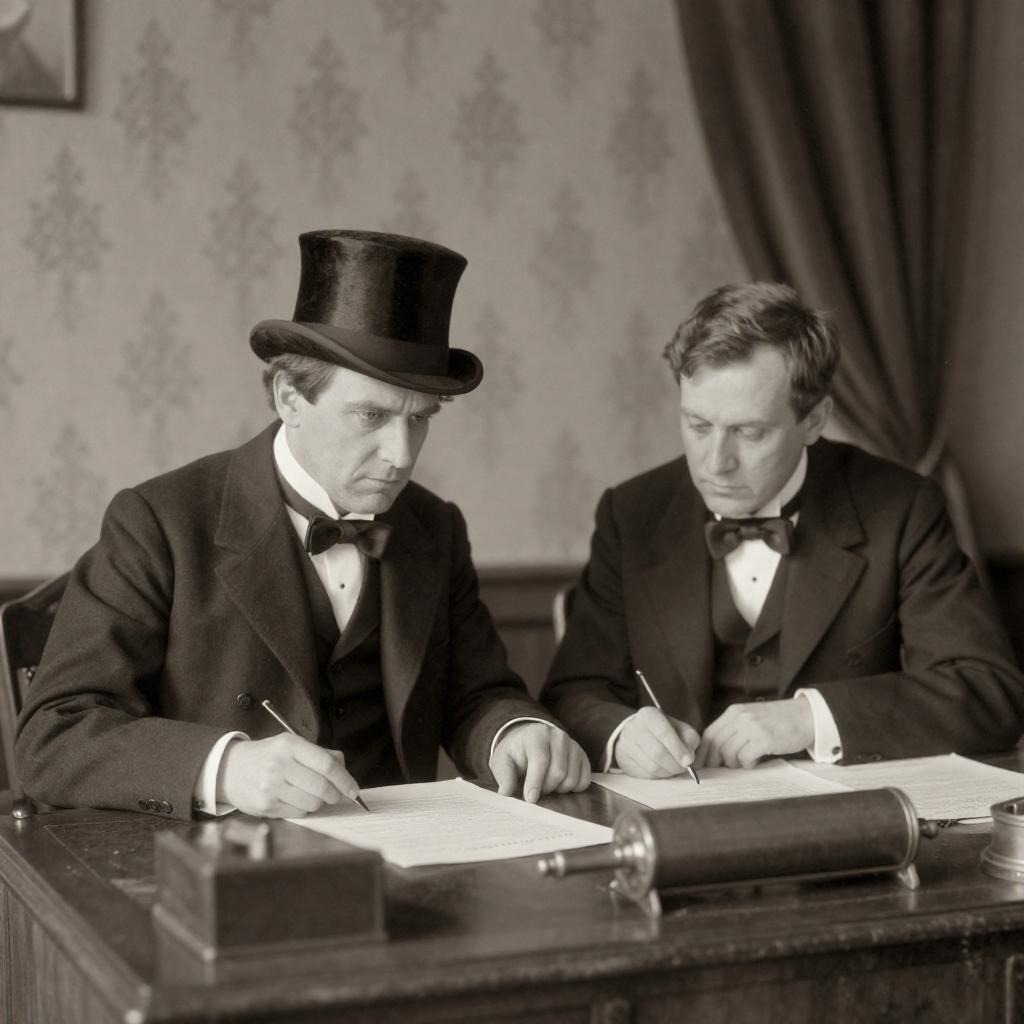 Sepia-toned photograph of four men in early 20th-century attire, gathered around a table in an ornate room. One man in a bowler hat and suit writes, another leans over a book, while two others, one in a hat and patterned shirt, observe. The background features intricate architectural details.